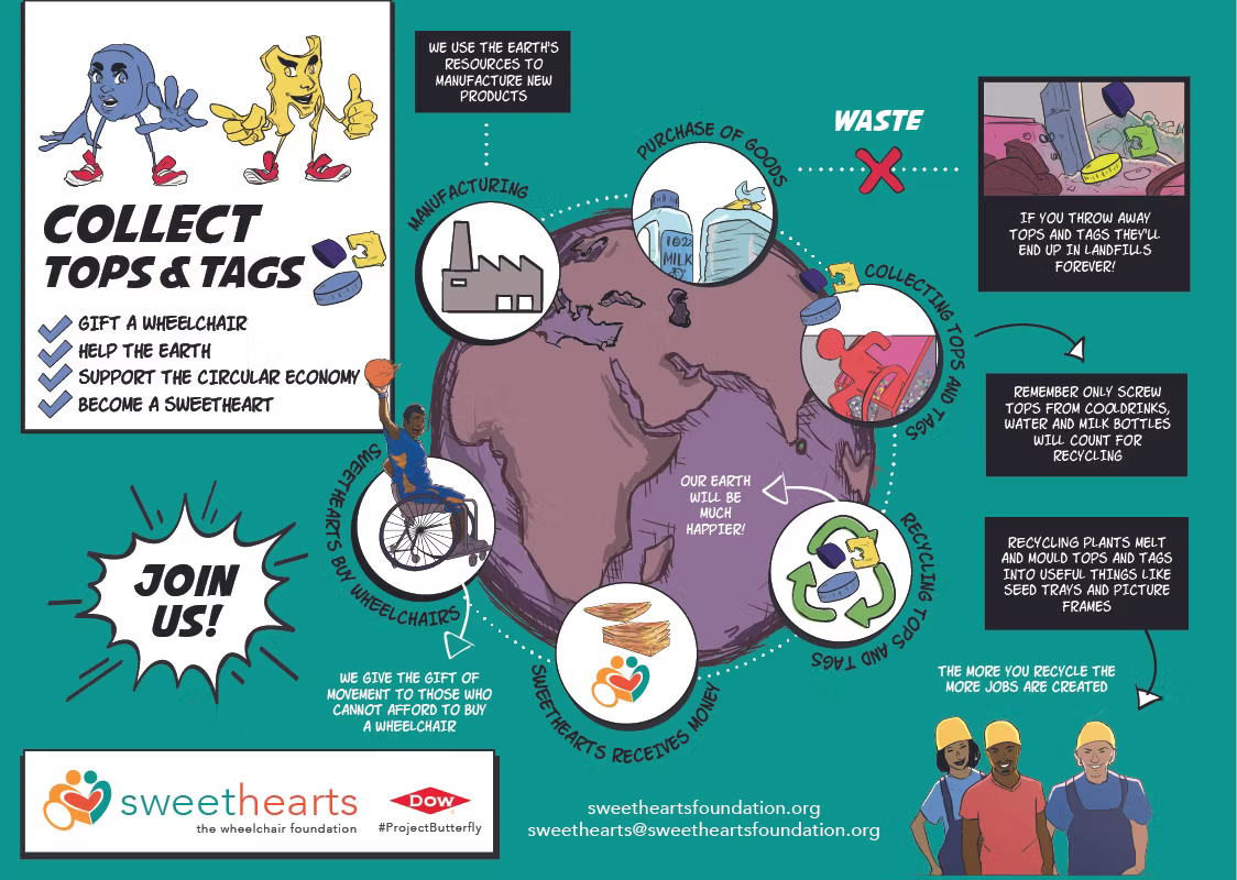If you know someone who needs a wheelchair, the Sweethearts Foundation makes it easy to apply. And for the rest of us, it's a simple way to make a big difference. So next time you're about to throw away a plastic top, remember Topsy and Tagz, and the Sweethearts Foundation. It's a small act that can have a life-changing impact.