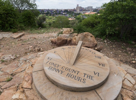 "I only count the sunny hours," says the face of the dial. And below that, around the circular edge: "Blessed too is he who learns to know the gods of the Wilds. www.sundials.co.za." T.J. de Klerk installed this sundial in 2005.